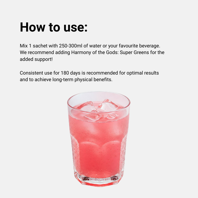 Mix 1 sachet with 250-300ml of water or your favourite beverage. We recommend adding Harmony of the Gods: Super Greens for the added support!