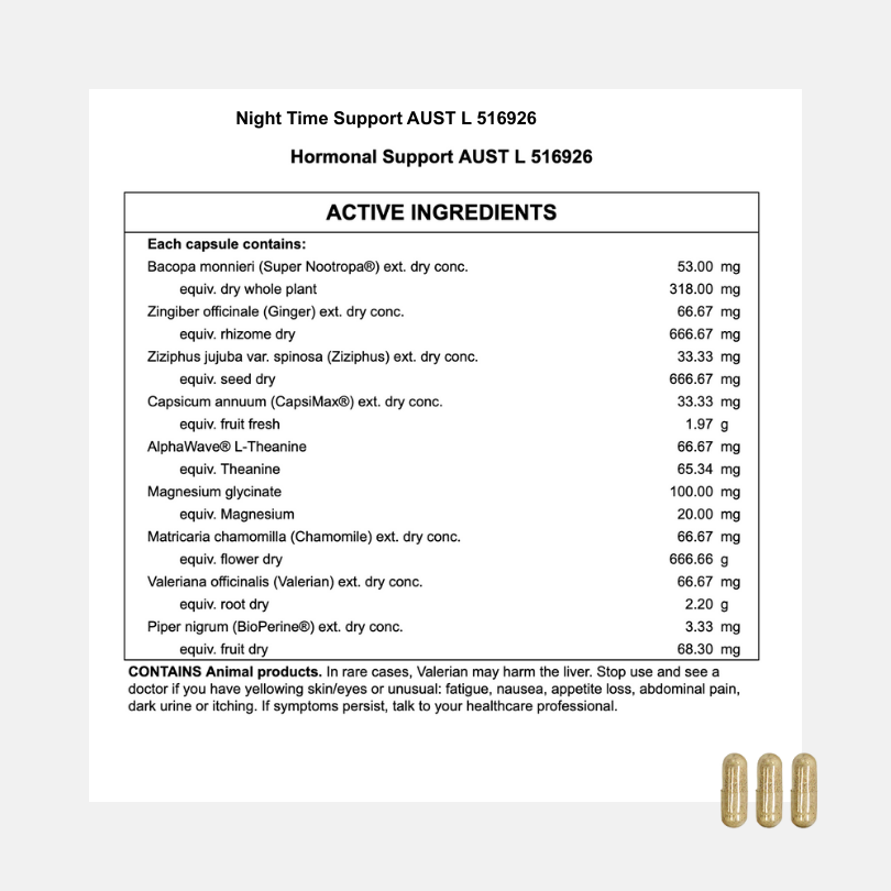 Night-Time Support is formulated to give you everything you need and nothing you don’t. Each serve is delivered in plant-based vege caps, with no added sugar, no artificial colours, no synthetic flavours, and no unnecessary fillers. Whether you're focused on clean ingredients, reducing additives, or supporting your metabolism, this formula keeps things simple and purposeful. By removing common irritants found in traditional supplements, Night-Time Support offers a clean, efficient daily option designed to support your goals without compromising your routine or your gut.