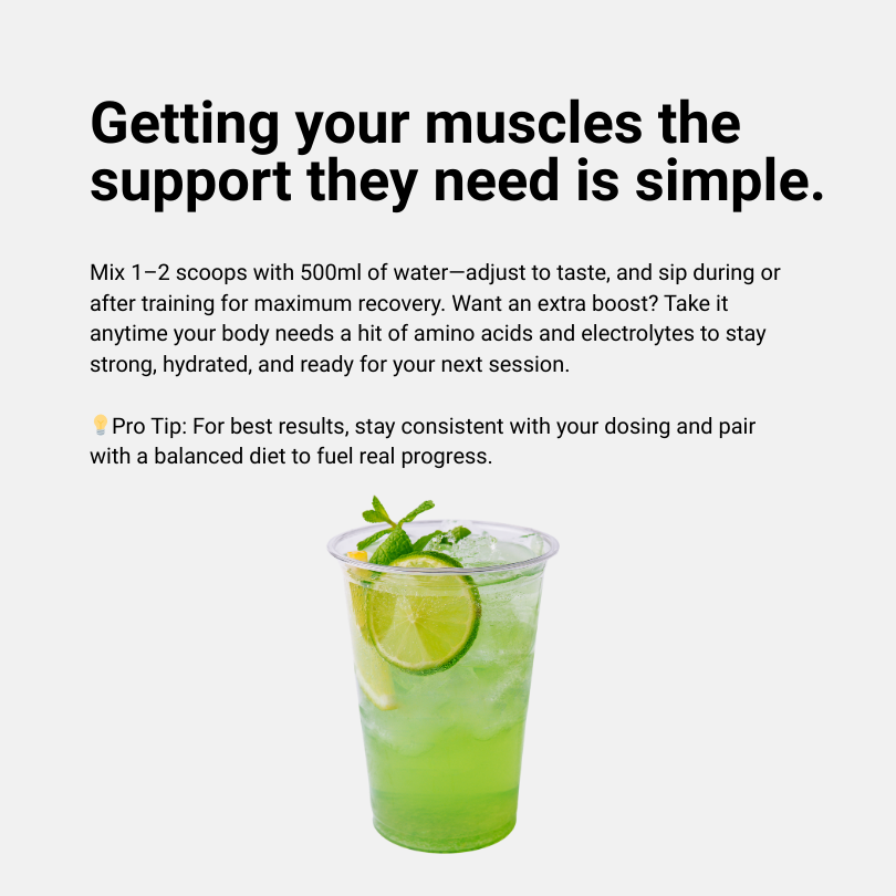 Getting your muscles the support they need is simple. Mix 1–2 scoops with 500ml of water—adjust to taste, and sip during or after training for maximum recovery. Want an extra boost? Take it anytime your body needs a hit of amino acids and electrolytes to stay strong, hydrated, and ready for your next session.