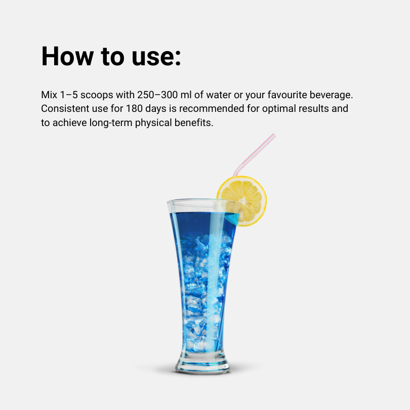Mix 1–5 scoops with 250–300 ml of water or your favourite beverage. Consistent use for 180 days is recommended for optimal results and to achieve long-term physical benefits.